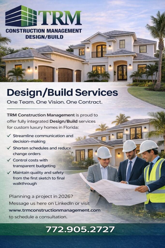 At TRM Construction Management, we bring your vision to life through a fully integrated Design/Build approach—one team guiding your project from the first sketch to the final walkthrough.By managing design, budgeting, and construction under one roof, we help our clients build smarter, faster, and with greater confidence—whether it’s a custom Florida home, addition, or major renovation.If you’re planning […]