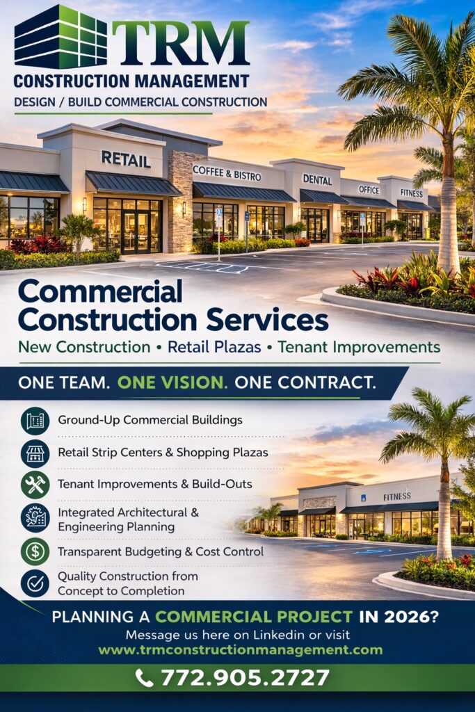 Transforming tenant spaces is what TRM Construction Management does best. From shell condition to move‑in ready, our team delivers design‑build tenant improvement services for retail, medical, and professional office clients along the Treasure Coast.Whether it’s a vibrant restaurant, a modern medical suite, or a professional office, we manage every step—from design coordination and permitting through […]