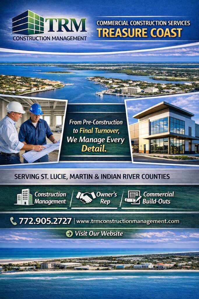 If you’re considering a new commercial project or expansion along the Treasure Coast, let’s talk about how TRM Construction Management can guide you from concept to completion. Visit www.trmconstructionmanagement.com or call 772.905.2727 to get started.
